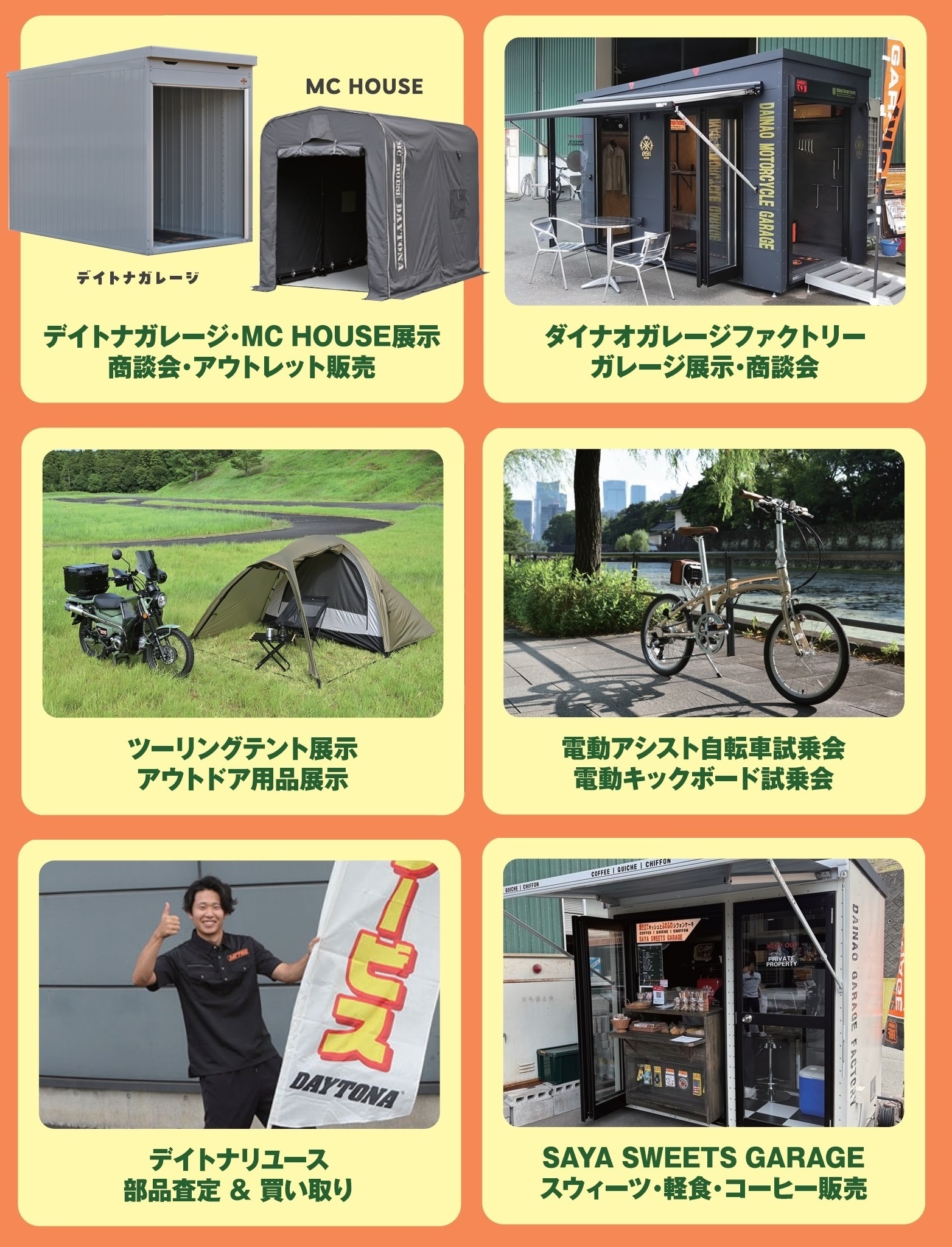 ・デイトナガレージの全モデルの展示、バイクテント「MC HOUSE」全サイズの展示、アウトレット販売