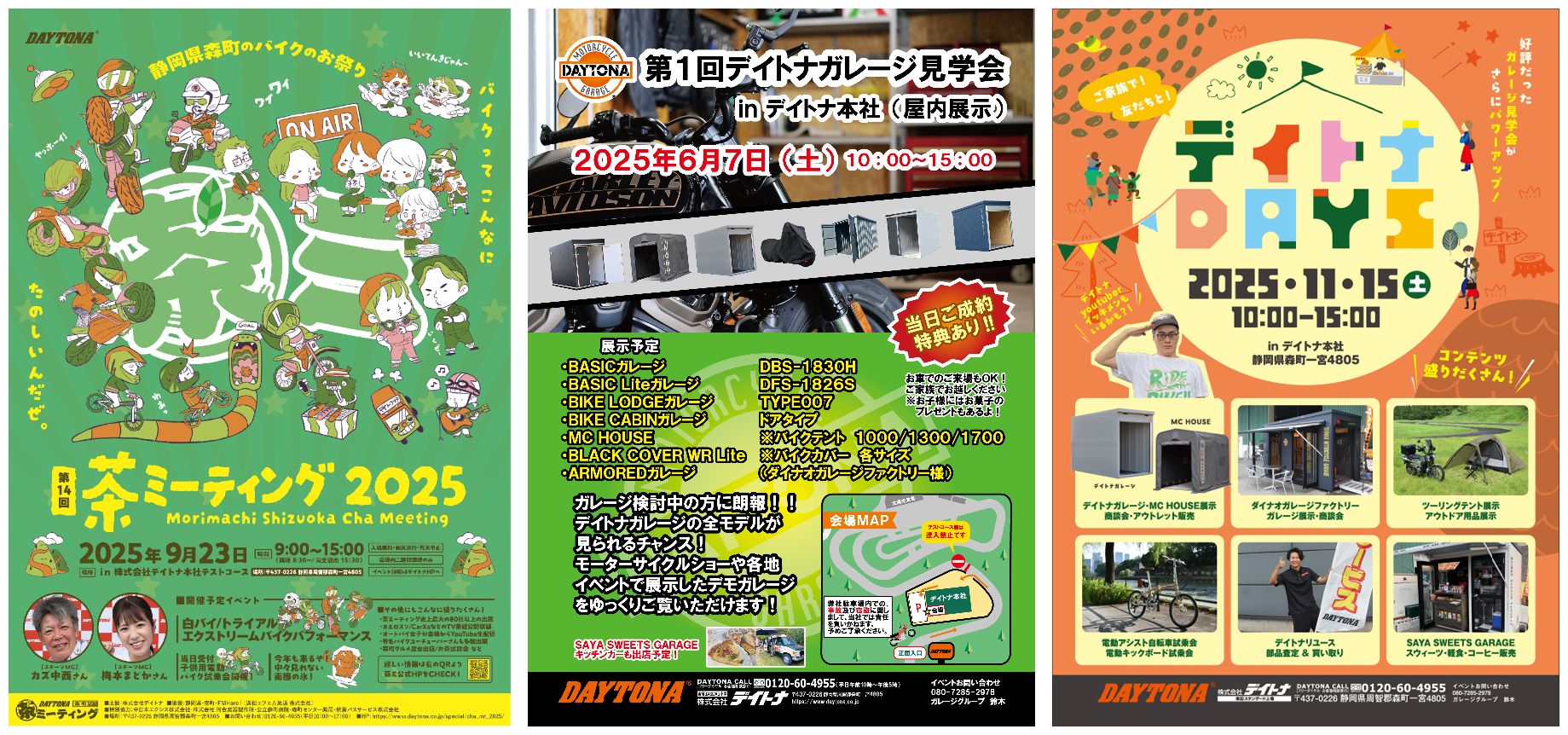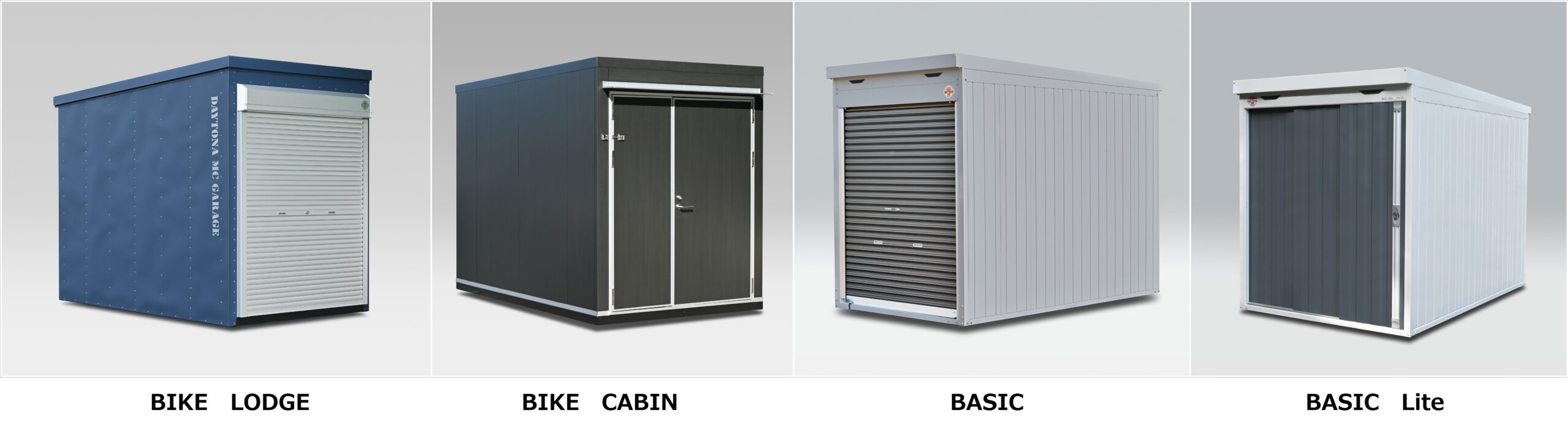 デイトナのガレージ「BIKE LODGE」「BIKE CABIN」「BASIC」「BASIC Lite」、4棟を同時にご覧いただけるのは、デイトナ本社で開催する「茶ミーティング」もしくはこの「ガレージ見学会」のみ!