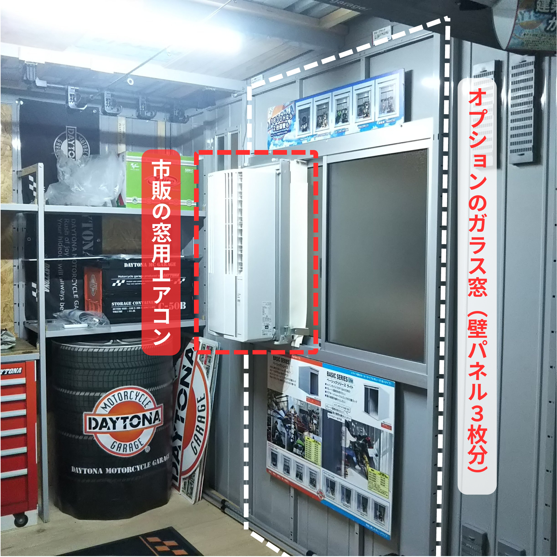 去年までは、オプションのガラス窓を取り付け、そこに窓用エアコンを装着したデモガレージを全国のイベント会場で展示してきました。