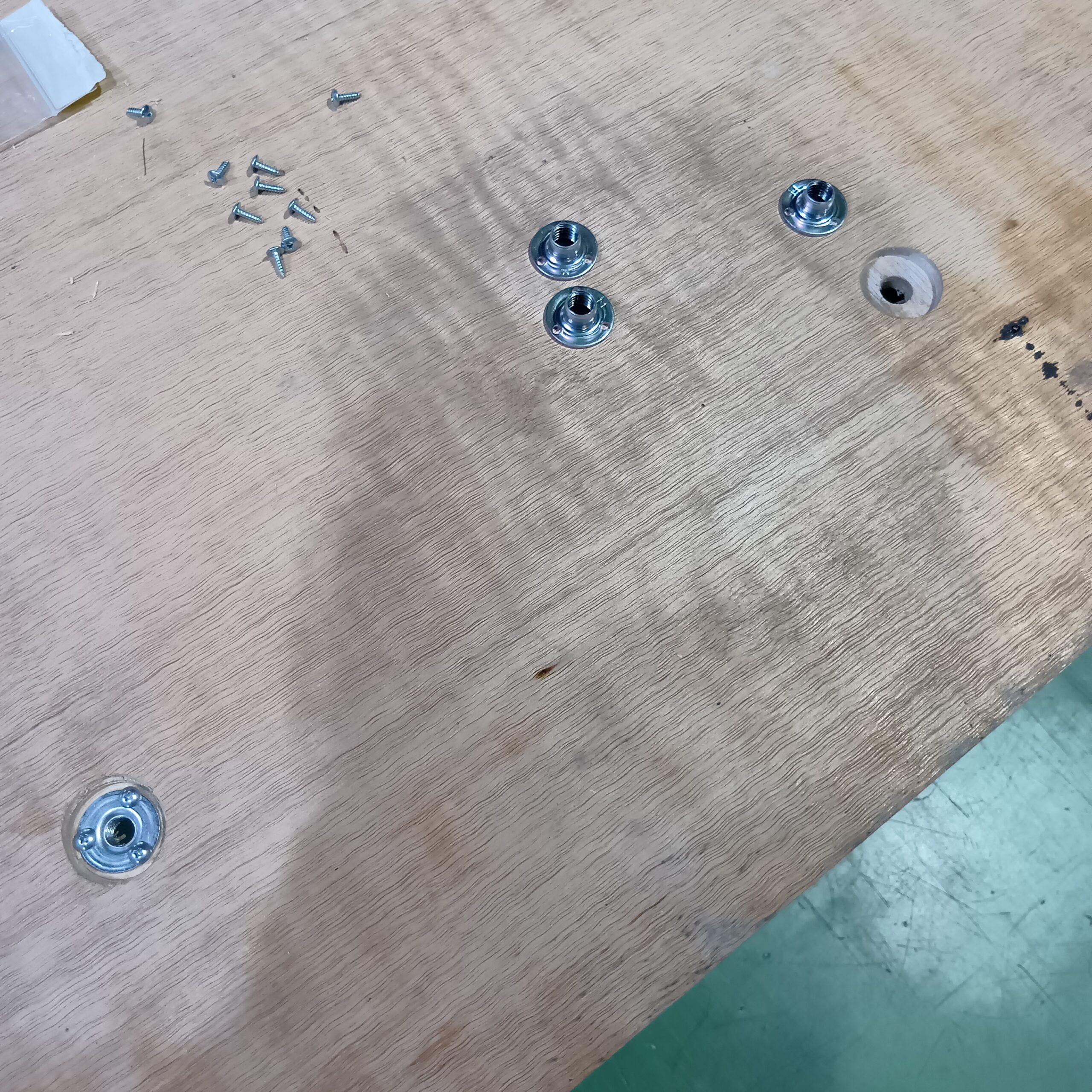 床板を裏返し、ザグリ穴をあけて、ホームセンターで買ってきたナットを忍ばせます。